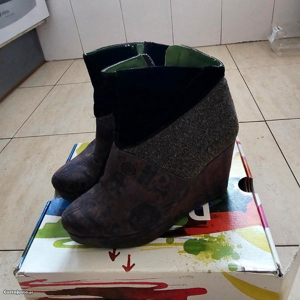Botins pelo tornozelo da marca desigual de salto alto com fecho. Novos, nunca usados, com a embalagem e etiqueta originais de compra. Multicolorida, tem verde no interior, cinzento, preto e um bordeux escuro no exterior. Super elegantes, bonitas e adequadas para qualquer tipo de ocasião. Mando mais fotos a pedido.