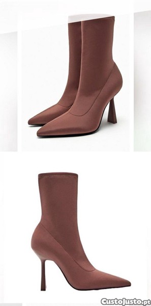 Sapato tipo botim de tacão em pele. Fecho de correr. Biqueira pontiaguda