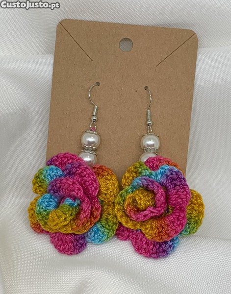 Brincos únicos, feitos à mão em croché, em formato de flor com cores vibrantes (rosa, amarelo, azul e verde).