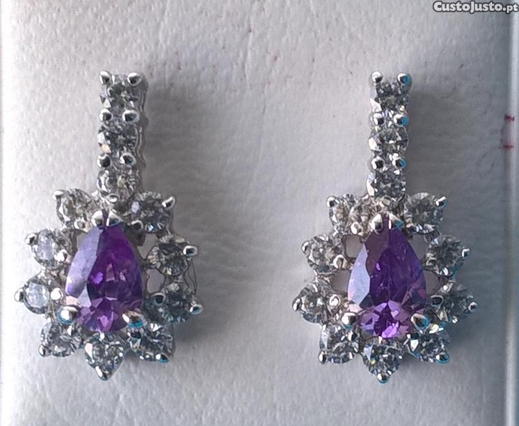 Vendo par de brincos em prata de lei 925 com brilhantes e pedra zircônia ametista . Tamanho 1,5 X 1 cm . Inclui portes em correio registado .