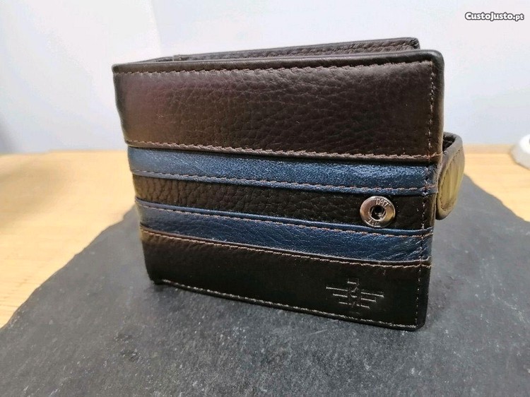 Carteira em pele em tons de castanho com 2 tiras em tons de azul.
