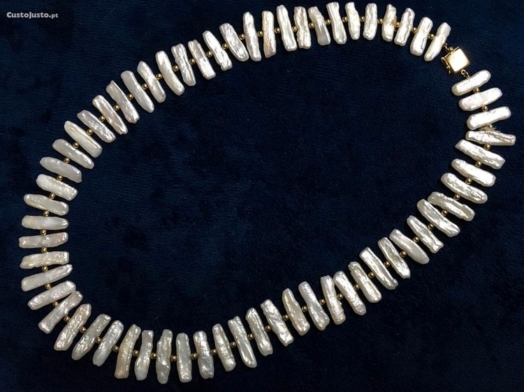Colar de pérolas barrocas rectangulares brancas e contas em ouro de 18k.