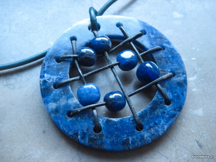 Vendo Colar couro e fecho prata c/ pendente pedra semipreciosa azul em estado NOVO, pois nunca foi usado(presente que tem estado guardado). Diâmetro do pendente = 5 cms