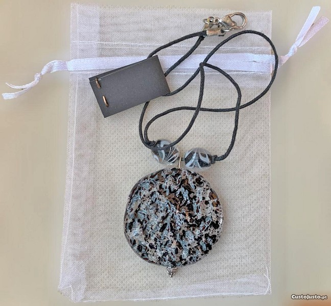 É de óptima qualidade, o fio propriamente dito é completamente preto e fecha atrás com fecho de gacho, em metal prateado. À frente, possui um adorno em acrílico de grande qualidade, em preto e transparente, todo em relevo, com um design em formato circular, terminando em baixo num pequeno pingente em metal. Este é ladeado por duas pedras transparentes com arabescos a branco, o que lhe confere uma aparência muito requintada. É muito invulgar e original. O fio é curto, para ficar junto à base do pescoço. Possui um saquinho de tom branco para o transportar e guardar. Esta é uma peça de artesanato e é um exemplar único e exclusivo, não existe outro igual.