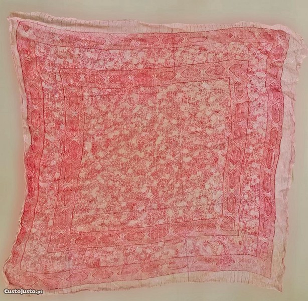 É muito invulgar e original, muito leve e fresco. De cor base rosa claro, possui estampado a rosa mais forte um padrão floral com figuras geométricas, adornadas com uma linha prateada a cada centímetro, o que lhe confere grane sofisticação. É transparente. Pode ser usado como complemento ao pescoço, à cintura, numa mala de ombro, etc., bem como pode ser dobrado, enrolado, etc., é extremamente versátil, moderno e prático, combinando muito bem com diferentes tipos de estilos e ocasiões, sejam mais formais ou mais casuais, descontraídas ou desportivas, dependendo das peças com que combina.