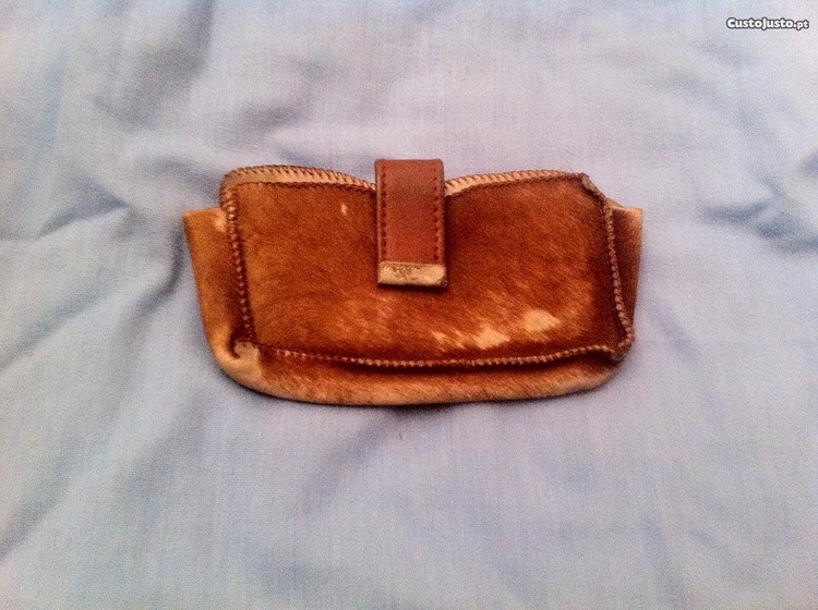 A bolsa castanha em pele com pelo serve também para guardar maço de lenços de papel.