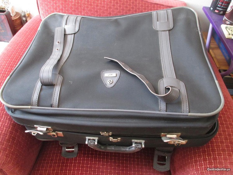 OBS: A mala apresenta bastante uso. Por dentro, o forro encontra-se um pouco descosido e falta-lhe o fecho do meio, embora isso não ponha em causa o bom fechamento da mala. Tem uma pega central e outra lateral.