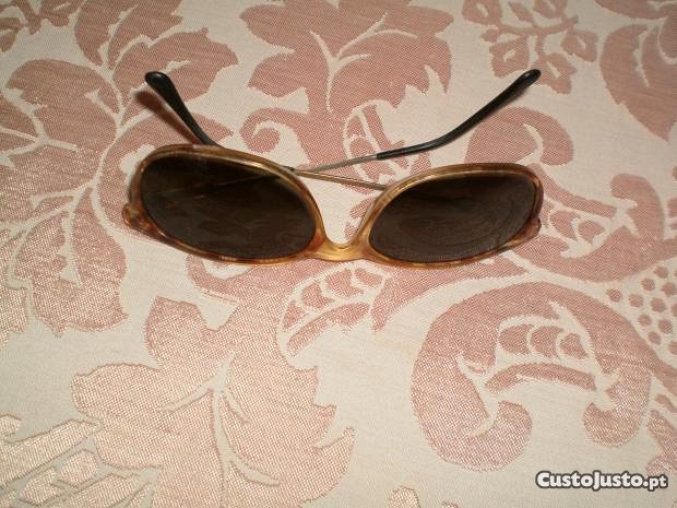Óculos de senhora em armação de massa fina com lentes escuras (cor castanho), com alguma graduação e com 13cm de largura.
