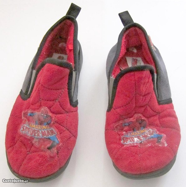 São de qualidade, da reconhecida marca Marvel, ORIGINAIS. Com cor de base vermelho à frente e cinza na parte de atrás, possuem o Homem Aranha, com a inscrição The Amazing spiderman, à frente. A parte vermelha daa frente tem um acolchoado pesponteado como que a imitar a teia de aranha. Possuem um acolchoamento e forro para melhor ajuste e permitindo uma postura correcta do pé. São muito quentinhas.