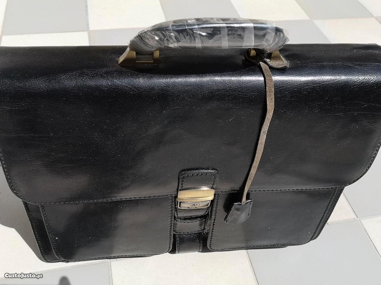 Mala de mão em pele cor preta com suporte de alça e fecho com chave.