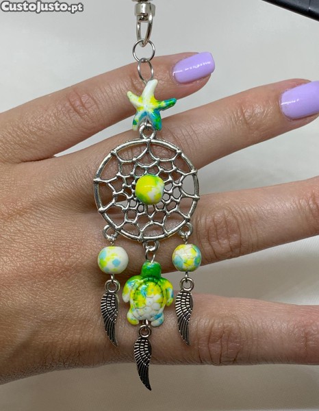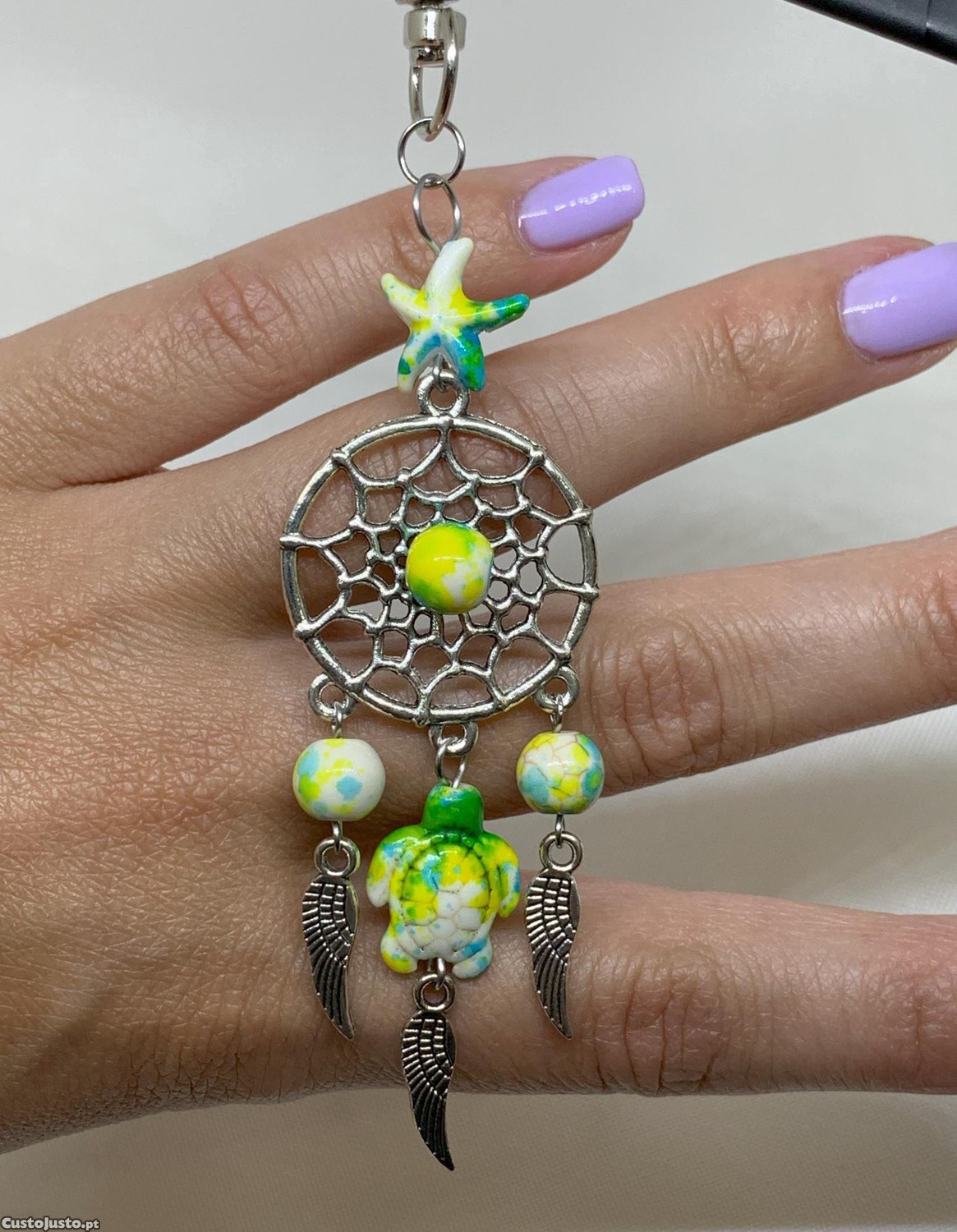 Porta-chaves cinzento com contas, estrelas e tartaruga verde