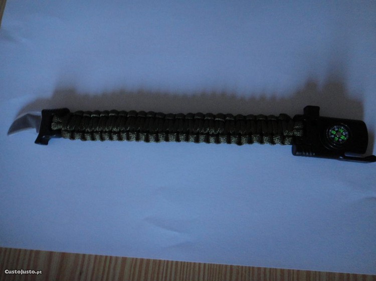 Tenho para venda estas pulseiras de sobrevivência , com bússola , apito , pedra sílex e faca , e cordão , boa para campistas caçadores , escuteiros , etc , material novo , só em verde , qualquer duvida disponha .