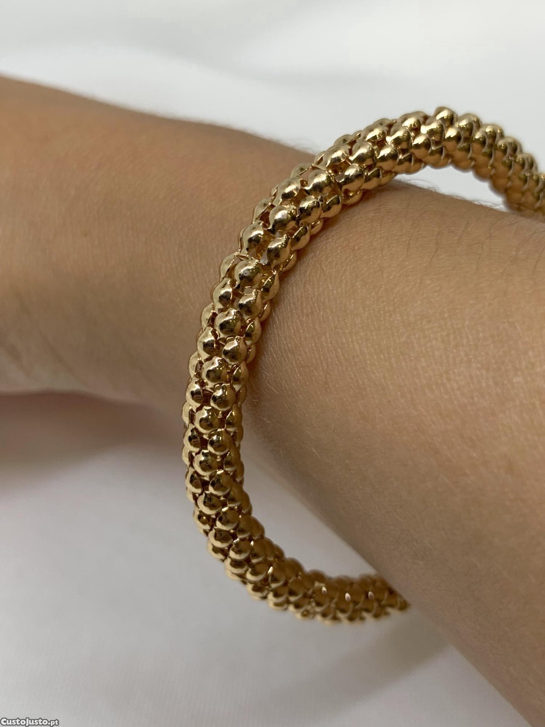 Pulseira elegante e versátil, com acabamento dourado e textura de pequenas esferas que lhe dão um brilho discreto e sofisticado.