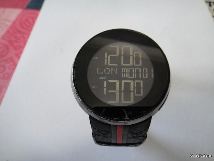 Tenho para venda da minha coleção particular este relogio Gucci mad. suiss , 100% original , com 44mm de diametro , em quartzo e digital , com luz para se ver há noite , todo em metal preto , bracelete em borracha , com 25 fusos horários de cidades de todo o mundo , com cronometro , data do dia , do mês e do ano , vidro de safira anti risco , qualquer duvida disponha .