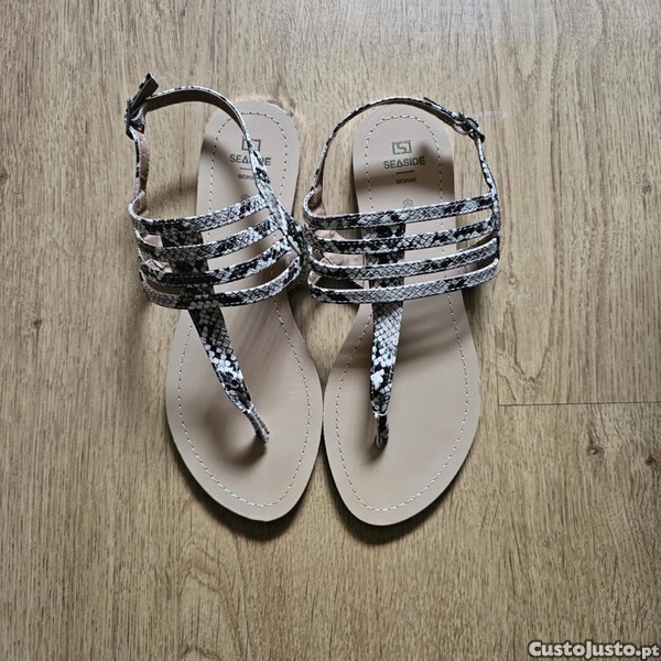 Sandálias rasas da marca Seaside com padrão leopardo preto e branco. Estão novas, nunca foram usadas e ainda se encontram na embalagem original. Muito bonitas para usar no Verão em qualquer ocasião. Tamanho 39.