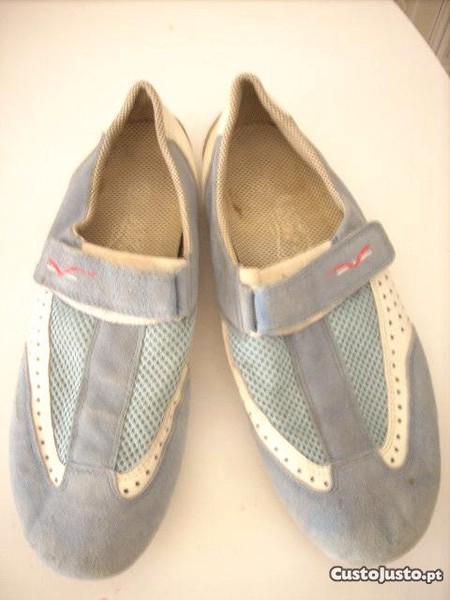 Sapatilhas em cor azul e branco, com fecho em velcro e N. 40.