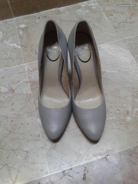 - Sapato alto de cor cinzento em pele. Salto alto fino forrado. Acabado em bico. Altura do tacão: 10,5 cm. Novos. Tamanho 38.