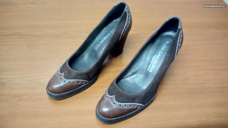 Sapatos de senhora castanhos, em camurça e pele, com sola de borracha, tamanho 37.