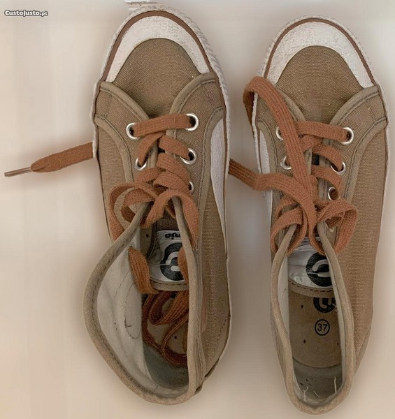 De qualidade, da reconhecida e icónica marca Sanjo, ORIGINAIS. Tem sola alta no todo e em branco, são de cor base bege escuro e acastanhado. Completamente constituídos por pele e tecido resistente anti-transpirante, para um maior conforto. Possuem o símbolo da icónica marca em pele de ambas as laterais atrás e na pala, sob os atacadores. Aperta com atacadores castanhos e possuem reforço no calcanhar, mantendo o pé na posição correcta. Por baixo, a sola é em borracha antiderrapante, para evitar deslizes. São muito cómodos e confortáveis. São versáteis e adequados a diversos estilos de situações e ocasiões, sejam mais casuais, descontraídas ou desportivas, dependendo das peças com que combina.