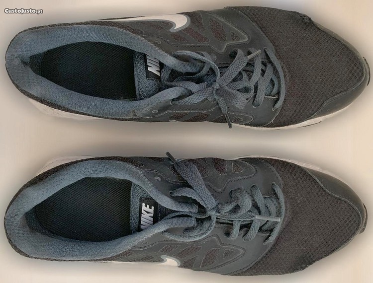 De qualidade, são da conceituada marca Nike, ORIGINAIS. De sola alta no todo e em branco, com uma subsola a preto são todos em preto, sem qualquer estampado, no entanto, possuindo de ambos as laterais o símbolo da reconhecida marca. Também possuem a identificação da marca na pala por baixo dos atacadores. São constituídas pra um misto de rede anti-transpirante, tecido e borracha. Os atacadores são também em preto. Por baixo, a sola é em borracha antiderrapante, para evitar deslizes. São muito cómodas e confortáveis e óptimos para a prática de desporto. São versáteis e adequados a diversos estilos de situações e ocasiões, sejam mais casuais, descontraídas ou desportivas, dependendo das peças com que combina. Têm marcas de uso, visível nas fotos.