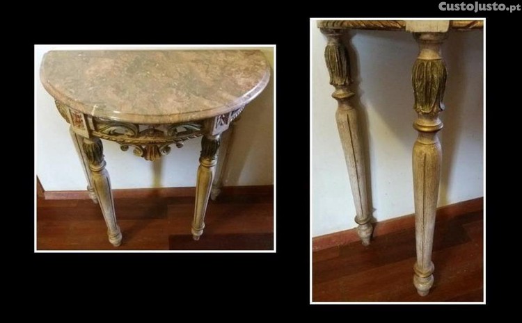 Credência, estrutura em madeira carvalho, acabamento em dourado envelhecido, tampo em mármore genuíno, grande efeito decorativo, C70 x L35 x A73cm, muito estimada.