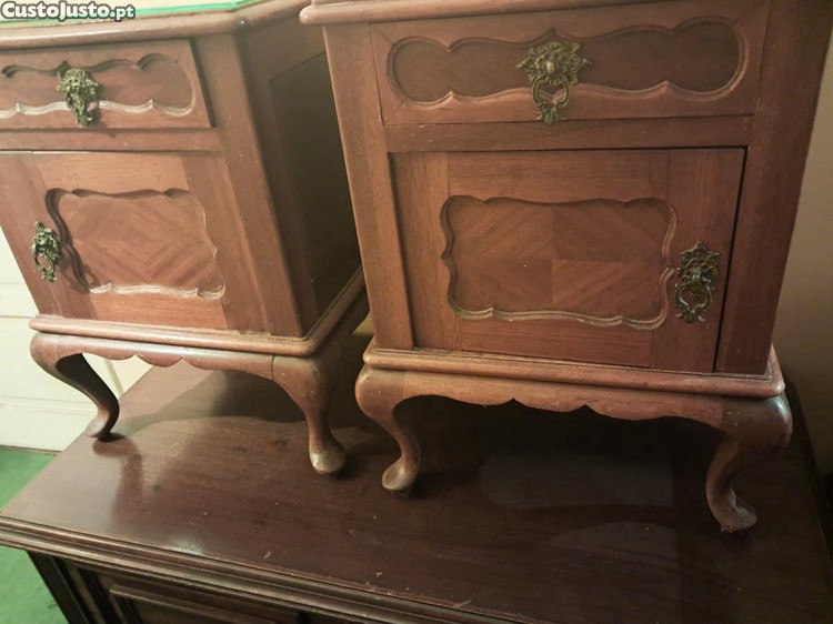 2 mesas de cabeceira em madeira, com 1 gaveta, pequena porta para zona de arrumo e 2 vidros para tampos