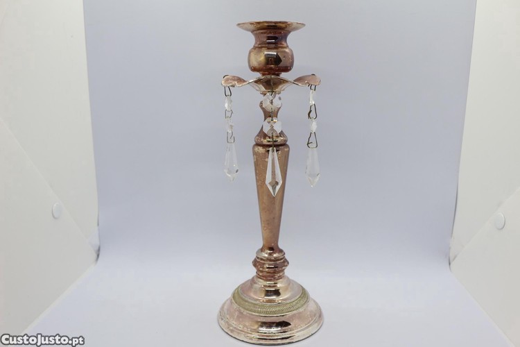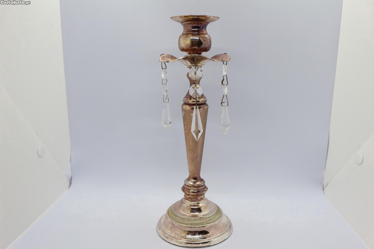 Castiçal de pé alto, base redonda corpo afunilado e termina em formato de flor com 4 pendentes em vidro.