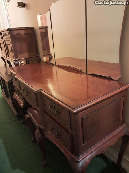 Aparador de quarto em madeira, com espelho, 5 gavetas e banco estofado