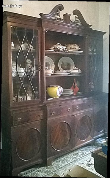 Os corpos laterais são constituídos por 2 portas com vidrinhos estilo inglês e têm 2 prateleiras no seu interior; corpo inferior com 2 gavetas e 2 portas (interior 2 prateleiras).