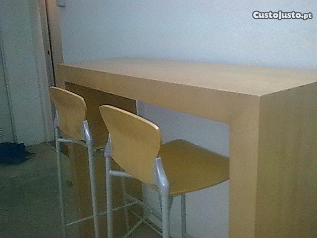 Balcão de refeições ou outra função em folha de madeira de faia c/ tampo e laterais de 8 cms de espessura (em caixa) sendo os cantos em 1/2 esquadria e varão inox para apoio de pés. Inclui 2 bancos também em faia com travessas para apoio de pés (muito resistentes).Tudo c/pouco uso.Medias do balcão: Comp. 120 cm x Prof. 40 cm x Alt. 106 cm