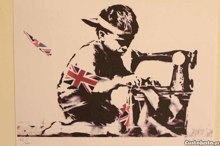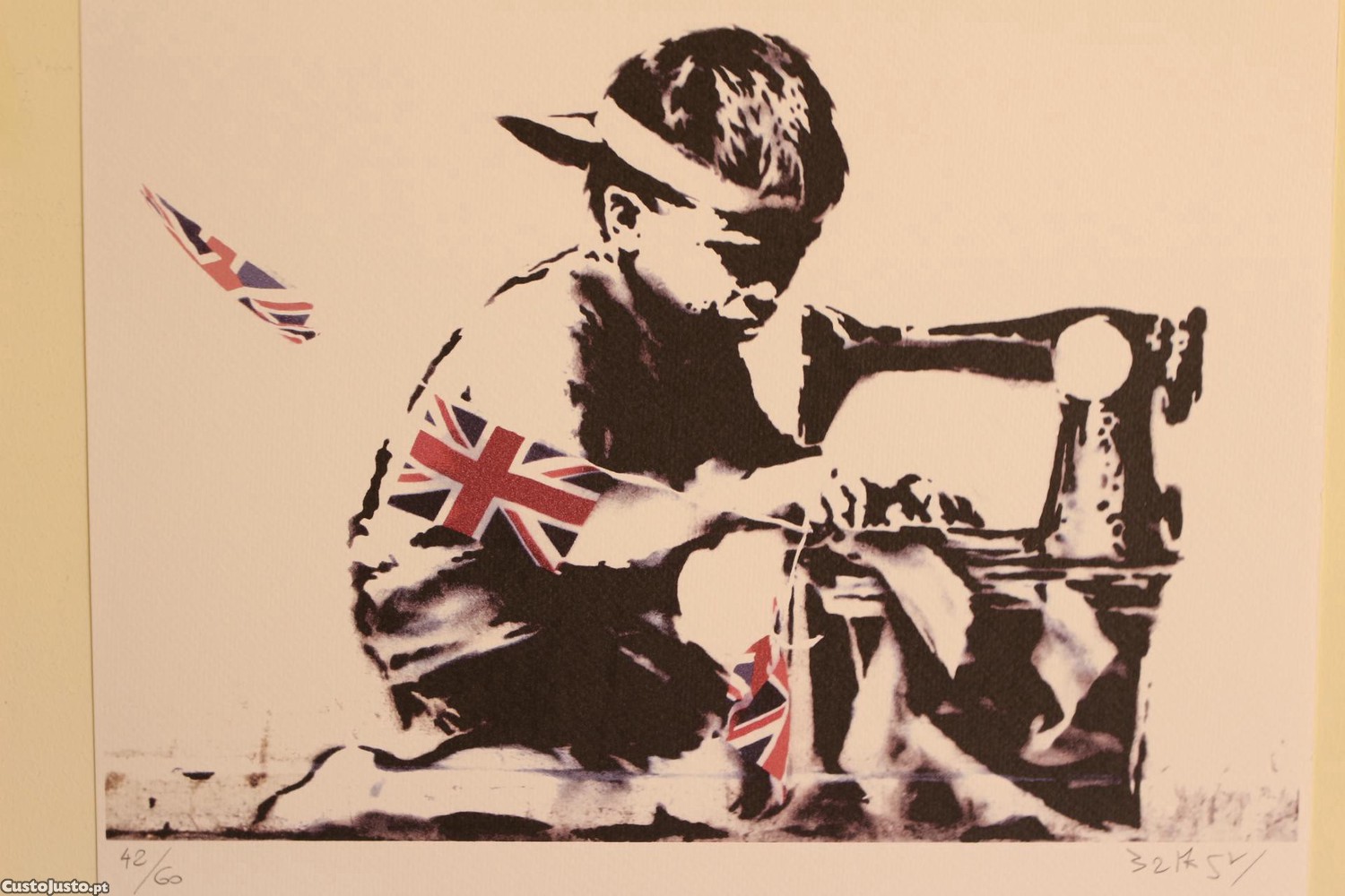 Banksy Litografia Numerada 42/60 e Assinada a Lápis pelo Artista 50x35 cm. Sendo assinada também a lápis assemelha-se á técnica da serigrafia. As Litografias normalmente tem assinatura impressa