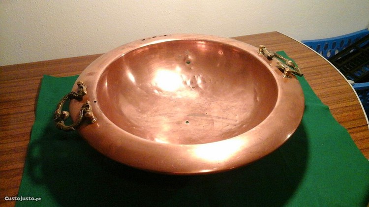 Braseira antiga em cobre com pegas trabalhadas em estado impecável, diam 46 cm, peso 2,030kg.