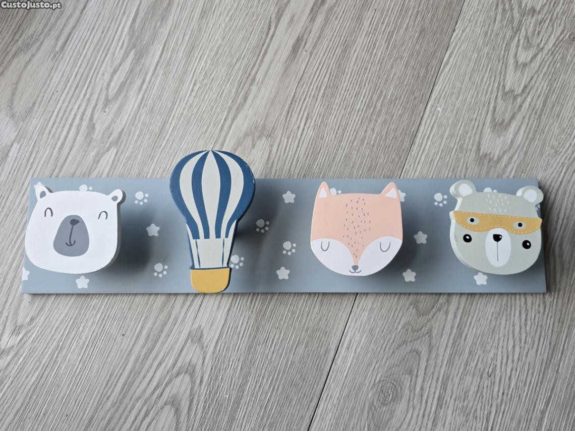 Cabideiro de parede decorativo, para quarto de criança. Com 40 cm de largura e 4 pontos de para pendurar. O artigo encontra-se totalmente funcional apenas uma das peças teve de ser colada e reforçada. Ver fotos.