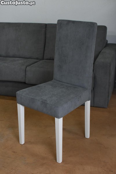 Cadeira de costas altas, toda estofada a tecido cinza e com pés lacados a branco.