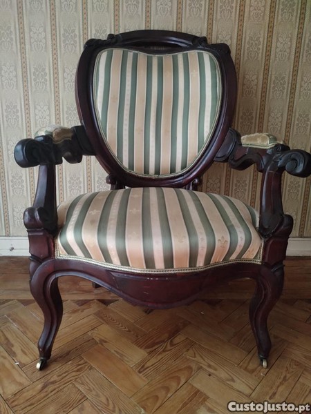 Cadeirão antigo com estrutura sólida em madeira maciça (MOGNO) com entalhes trabalhados artesanalmente. Estrutura robusta, estável e confortável. Pronto a usar ou a restaurar a gosto. Algum sinal de uso no estofo e o desgaste visível no tecido dos braços estão refletidos no preço. Dimensões aproximadas: 1,05m (altura costas) 0,73m (largura entre braços) 0,53 (profundidade)