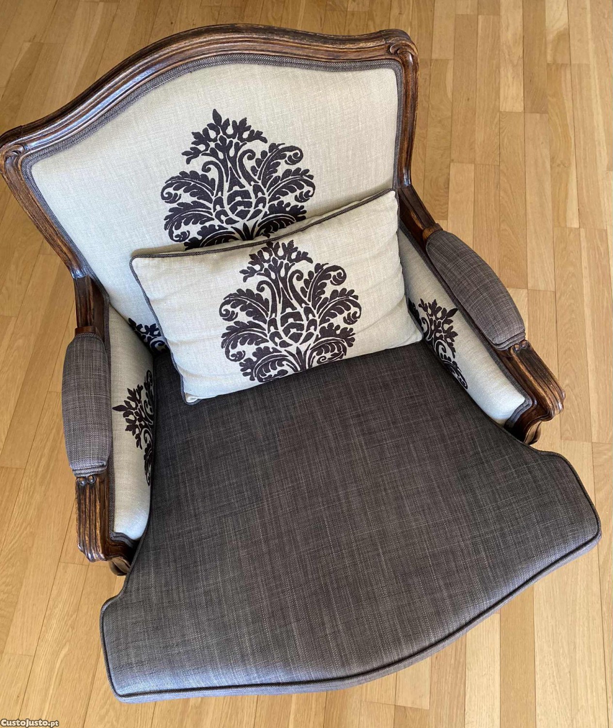 Cadeirão clássico de madeira trabalhada e forrado com tecido de tom beje e preto.