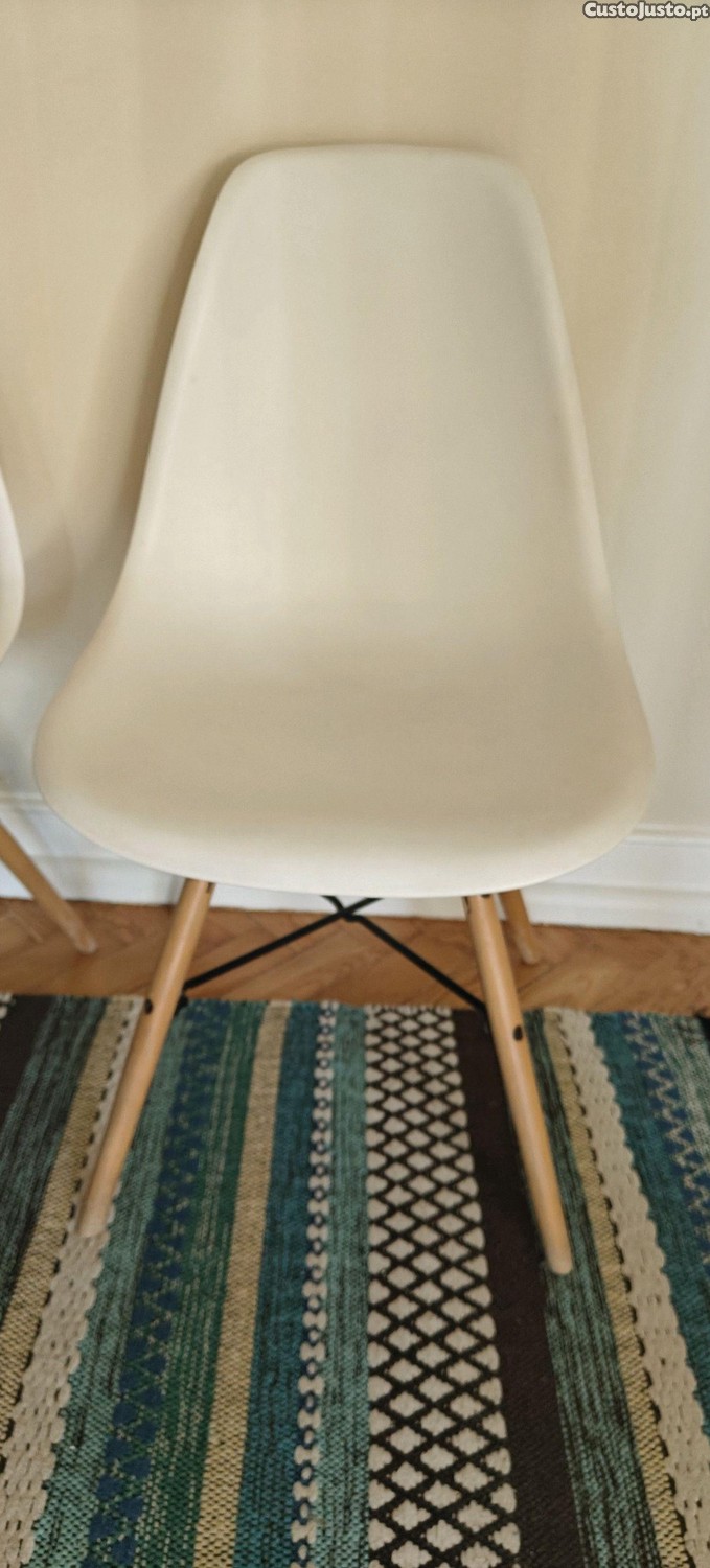 Cadeiras de cozinha brancas usadas, com design moderno e elegante. Feitas de plástico resistente e pernas de madeira, oferecem conforto e durabilidade. São uma ótima opção para atualizar a sua cozinha ou sala de jantar.