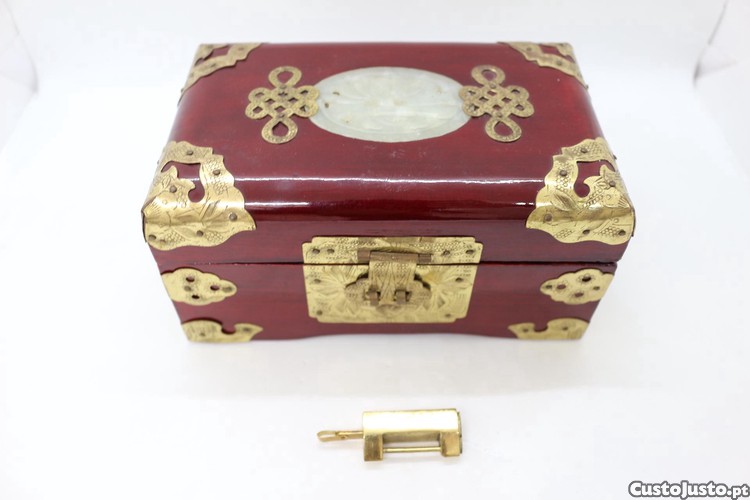 Caixa Chinesa em madeira Guarda Joias com Embutidos em Jade e Latão