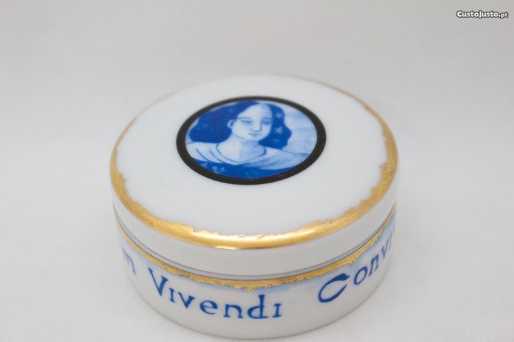 Caixa da Coleção Conviviorum Vivendi Voluptas, base branca com contornos a ouro e retrato de dama a azul e escrita em latim a azul