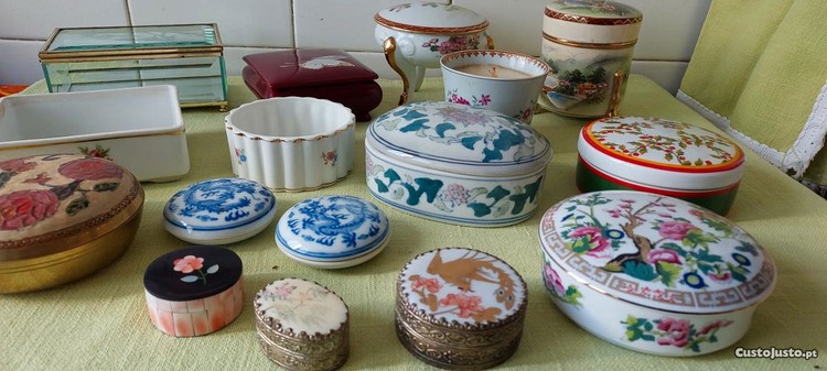 FOTO 1 - conjunto das caixas e FOTO 2- conjunto das caixas com as tampas de lado FOTO 3 - Caixa vidro transparente e tampa com desenhos esmerilados . 13 cm comp. X 7,5 cm largo X 5 cm altura - 20EUR Caixa vermelha com tampa e quatro pèzinhos ,desenho borboleta - Porcelana Limoges 9cm comp. X 8,5 cm largo X 4 cm altura - 25EUR Caixa com três pés e tampa. Porcelana Soko faisão,pintada à mão - Diâmetro 9 cm X 8,5 cm alrura- 15EUR Mesmo à direita (ver foto 1) Caixa porcelana Soko,cilindrica,com tres pequenos pés ( a tampa está colada) ,Pintura à mão,aldeia com ponte - 10EUR FOTO 4 -Copo com vela, cerâmica sec.XVIII.Dinastia Qing - branaca com florinhas - 10EUR Caixa com tampa,porcelana da China,desenho de dálias .11,5 cm comprido X 8,5 cm largo X 3,5 cm altura - 10EUR Caixa cerâmica ProArt,com tampa e desenho de flores- 9,8 cm diâmetro X 3 cm altura-10EUR FOTO 5 - Duas caixinhas porcelana cchinesa com dragões azuis- 6cm diâmetro X 2 cm altura 15EUR as duas Caixnha metal,tampa preta com flor em madre pérola 4 cm diâmetro X 2 cm altura - 5EUR Caixinha metal e porcelana para comprimidos,espelho interior da tampa , 4,5 cm comprido X 2 cm altura - 5EUR FOTO 6 caixa sem tampa ,cerâmica Vista Alegre, rosas pintadas - 11 cm comp X 9 cm largo X 4 cm altura - 10EUR Caixa metal redonda, tampa pintada com dálias, em closoné,made in Índia- 9,5 cm diâmetro X 4 cm altura- 10EUR FOTO 7 - caixa sem tampa toda recortada,porcelana de Coimbra Sf 8 cm diâmetro X 3,5 cm altura - 5EUR Na frente ,pequena cx. (ver foto1) redonda em metal,tampa pintada com pavão dourado. 5,5 cm diâmetro X 2 cm altura - 5EUR Vendo separado Posso entregar em mão na cidade de Lisboa