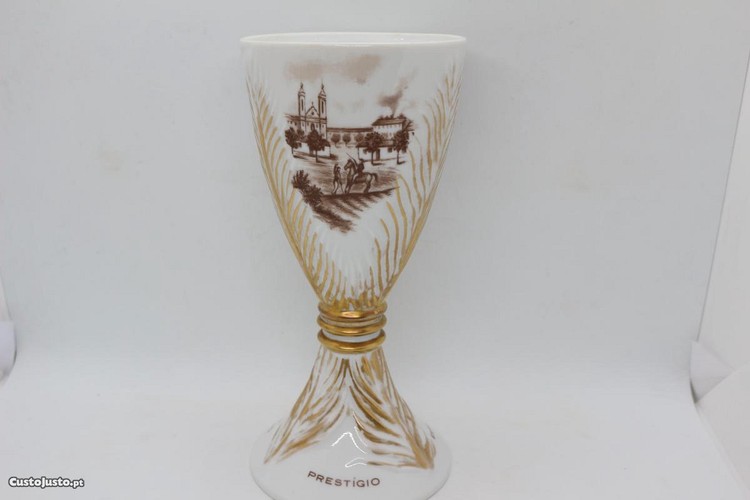 Cálice em porcelana moldada e relevada Comemorativo do 150º aniversário da Vista Alegre 1824 a 1974. Decoração a ouro vistas da Fábrica e inscrição 150 ANOS Trabalho Prestígio Expansão a castanho, parcialmente pintada à mão, tendo inscrição na parte de baixo "Peça oferecida pela Fabrica de Porcelana Vista Alegre a todos os seus colaboradores comemorando o seu 150º aniversário"