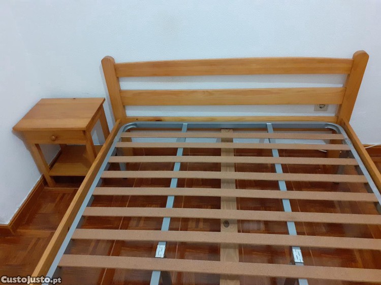 Cama de casal 190cmx140cm, em pinho maciço, com estrado e uma mesa de cabeceira. Tudo em bom estado de conservação. Está na Damaia de Cima, Amadora.