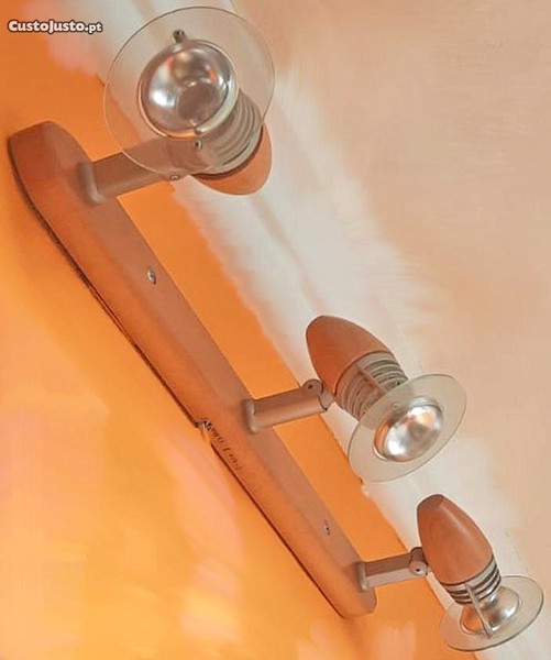 Com uma base rectangular em madeira, terminando com cantos suavemente arredondados, com focos de orientação direccionada independente. Focos com detalhes a tom madeira e cinza, com aro transparente protector da lâmpada e, em simultâneo reflector, que lhe confere um aspecto moderno no seu conjunto, mas simultaneamente discreto, permitindo complementar diferentes tipos de decoração e ambientes. Encontra-se em perfeito estado e inclui ainda três lâmpadas de marca Philips em luz tom quente.