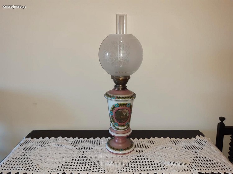 Candeeiro em muito bom estado. Corpo em louça com decorações florais, com cheminé e globo em vidro levemente fosco. 60W. Está em óptimo estado.