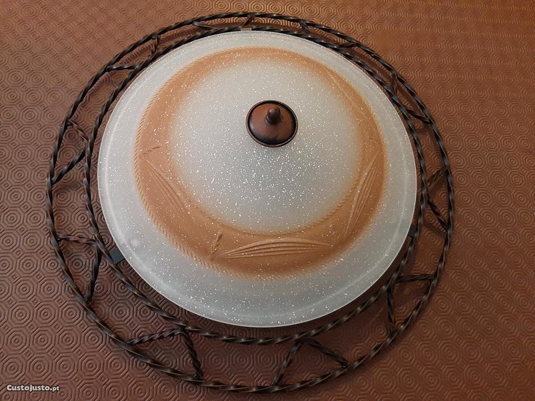Candeeiro de teto em muito bom estado. Base de metal e tampa em vidro. Diâmetro de 55 cm.