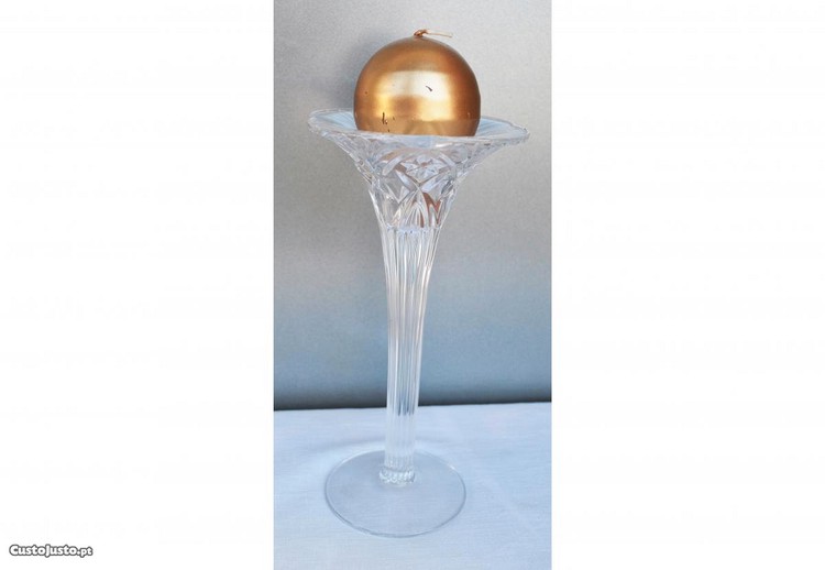 Preço: 5 €Candelabro em vidro com vela redonda dourada