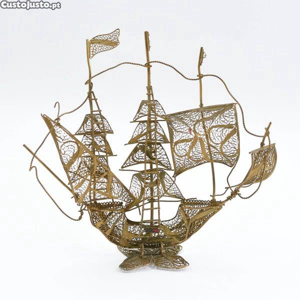 Caravela, trabalho de artesanato em filigrana portuguesa. Século XX. Sem marca de contraste visível, presumindo-se em prata dourada, com defeitos e faltas.