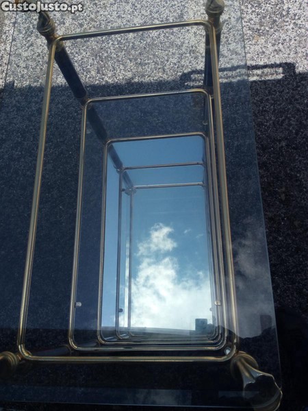 Carrinho usado, com estrutura em metal dourado, com rodas, constituído por 3 prateleiras, 2 de vidro e 1 espelho.