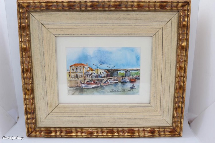 Quadro Catalina Sandulescu, Aguarela sobre papel assinado e datado 2014 com certificado de autenticidade. Motivo: "Docas de Portimão" acompanhado de currículo