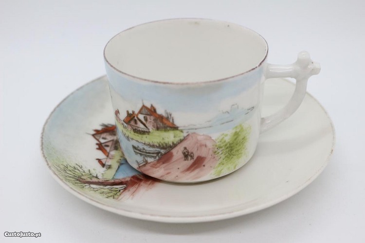 Chávena de chá com pires motivo paisagem com rio em porcelana Vista Alegre muito antiga 1881